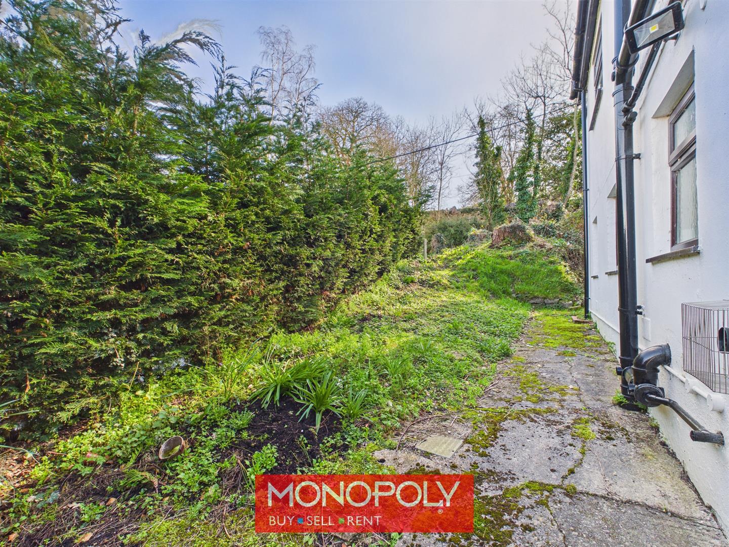 The garden offers an attractive and well-established outdoor space, with long grassy lawns interspersed by stone pathways that guide you through the grounds. Small stone walls frame pockets of flowers and mature foliage, adding character and charm throughout, while a mature hedge and stone wall border provide a sense of privacy and enclosure. A slate-covered area houses the oil tank, potting shed and a further wooden garden shed, creating a practical space for storage and gardening needs.