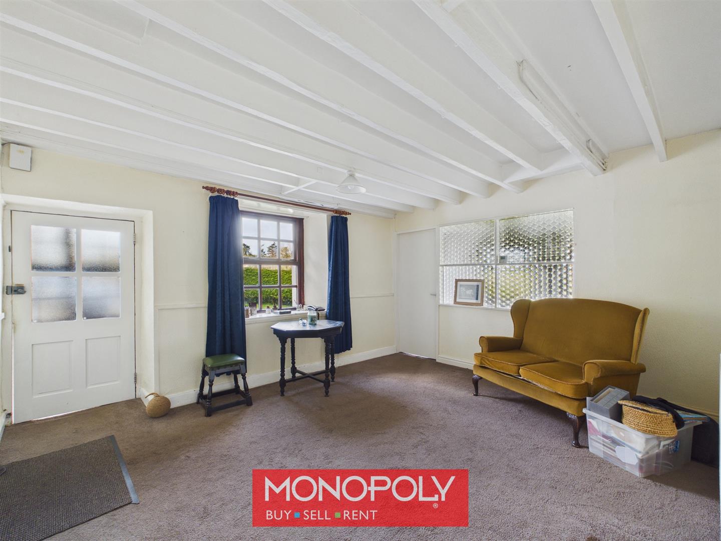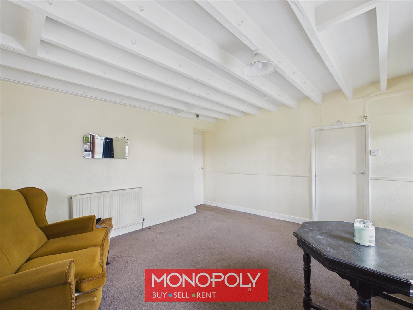 The lounge is a comfortable and inviting reception room, finished with carpeting and complemented by exposed wooden ceiling beams. A double glazed window to the front allows for good natural light, while a decorative internal window adds character and connects the room visually to the study. Doors lead to the study, hallway, kitchen and vestibule.